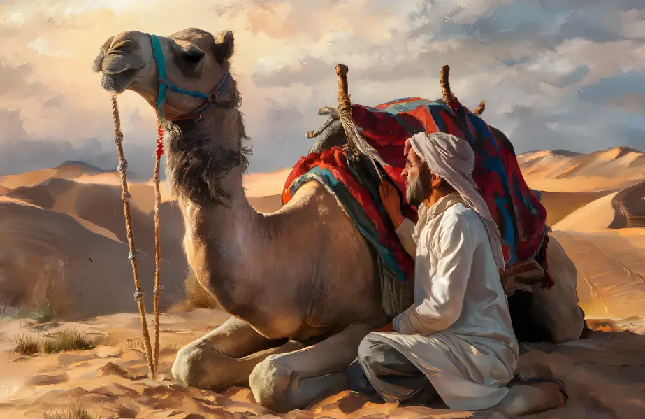 Era întuneric când bărbatul părăsise casa. Mâna lui noduroasă ținea strâns un căpăstru, ochii adumbriți de sprâncene stufoase erau mereu îndreptați spre băiatul său. Bucuria bătrâneților lui dormea. Lămpile purtate de călători luminau, când și când, fețișoara străvezie a copilului. Bătrânul nu plecase singur la drum. Înaintea lui, dar și înapoi, se puteau vedea bidivii înșirați ca mărgelele pe ață, mânați de vecinii săi, care-și cărau bolnavii spre oaza de sănătate ascunsă în inima deșertului.