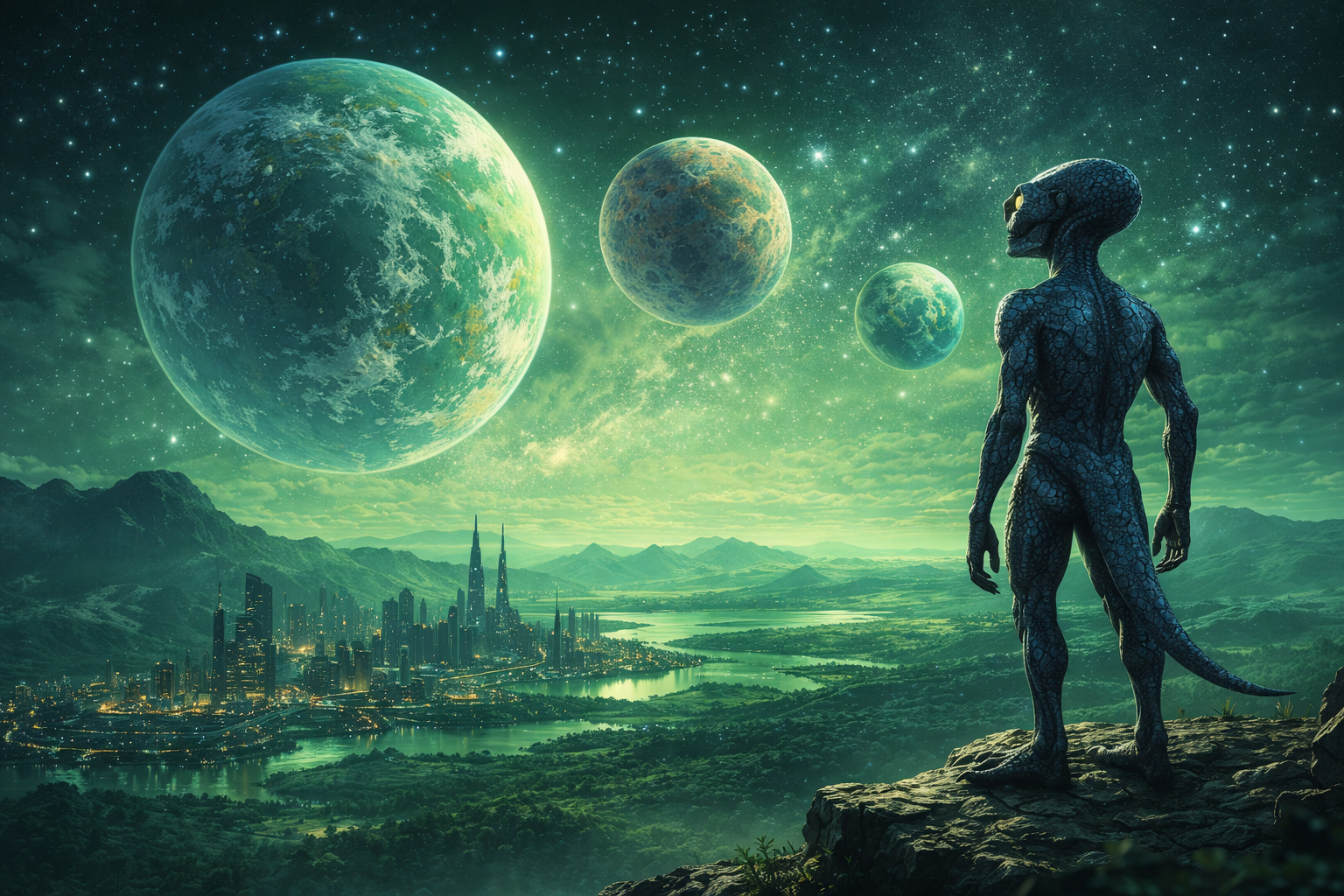 Înfățișarea lor ne–ar părea hidoasă și chiar, ce să ne ascundem după deget, monstruoasă și înfricoșătoare: trup zvelt, subțire, albastru–cenușiu, cu mici solzi (apăruseră ca adaptare la planetă? fuseseră așa dintotdeauna? nimeni nu prea știa), o coadă scurtă și groasă, gheare la picioarele cu trei degete, mâini cu câte patru degete subțiri și cu o dexteriate de neimaginat, un cap disproporționat de mare și cu creier așișderea pe un gât subțire (coloana era cu totul altfel decât a noastră pentru a–l putea susține), fără urechi și cu două nări subțiri, o gură cu buze lungi și aproape de nedeslușit, cu ochi lungi, care păreau mereu aproape închiși, și cu pupile ca o semilună verticală. De asemenea, erau întru totul spâni și cu mușchi impresionanți ca forță, având în vedere cât păreau de slabi. Trăiau undeva între 110 și 140 de cicluri mari. Trebuie să recunoaștem că toți de aici i–am numi reptile inteligente.